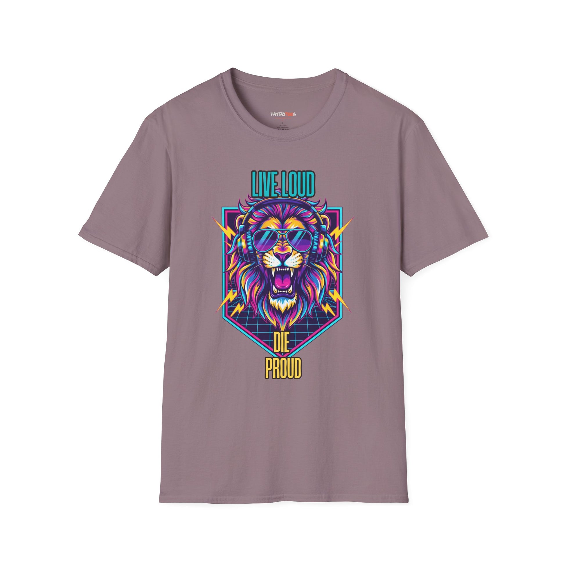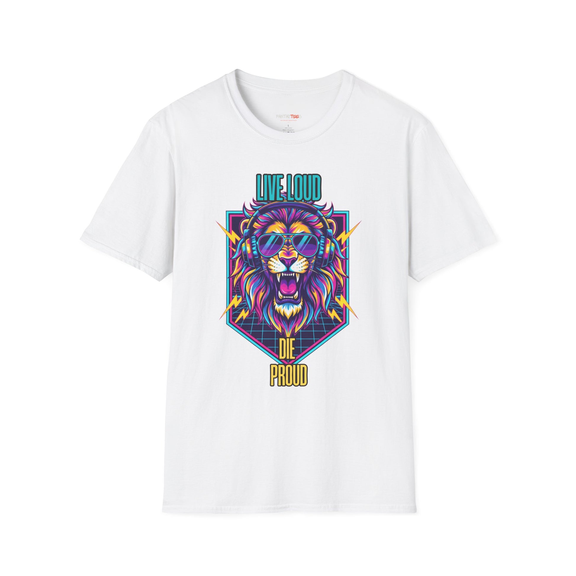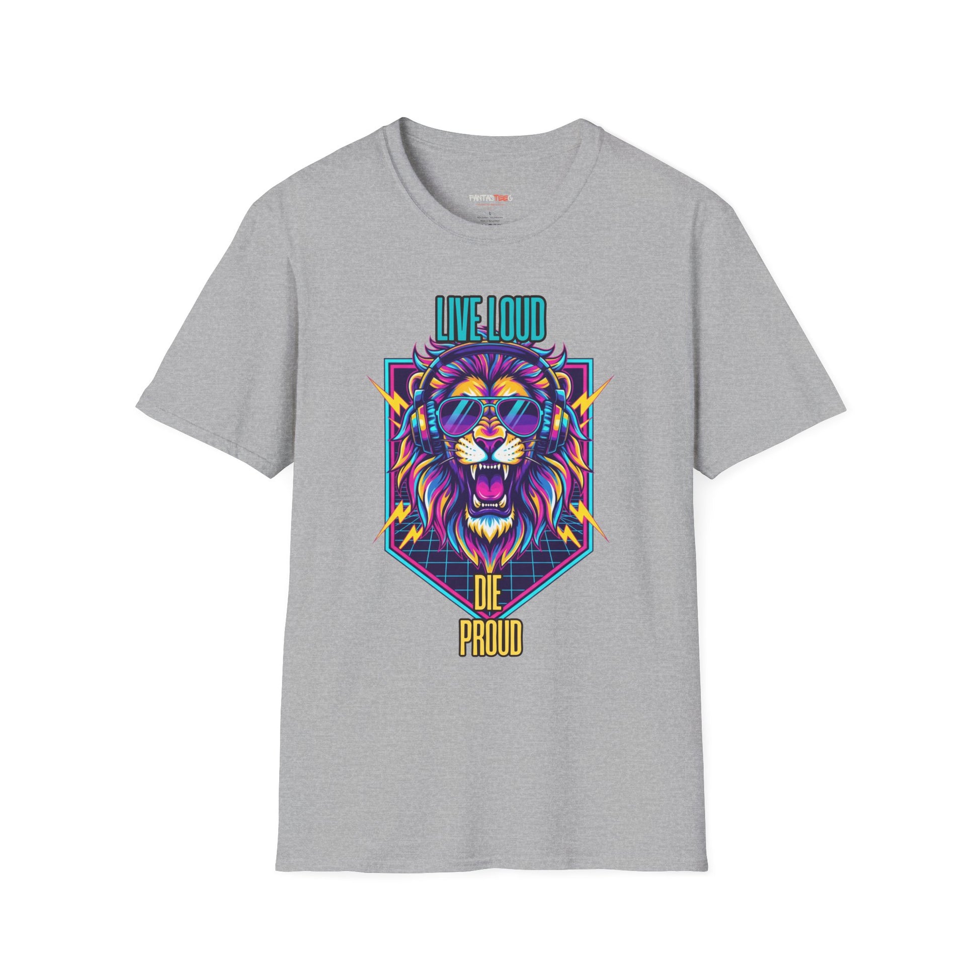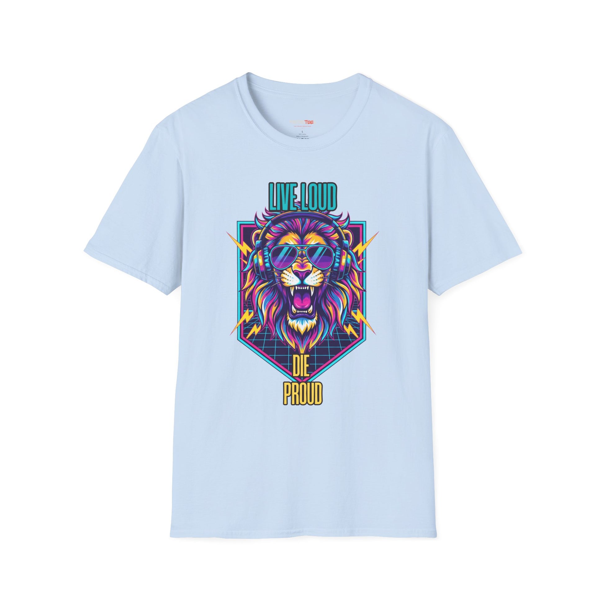 Vibrant Lion Graphic Tee | Unisex Softstyle T-Shirt with 'Live Loud Die Proud' Design, Casual Wear, Gift for Music Lovers.