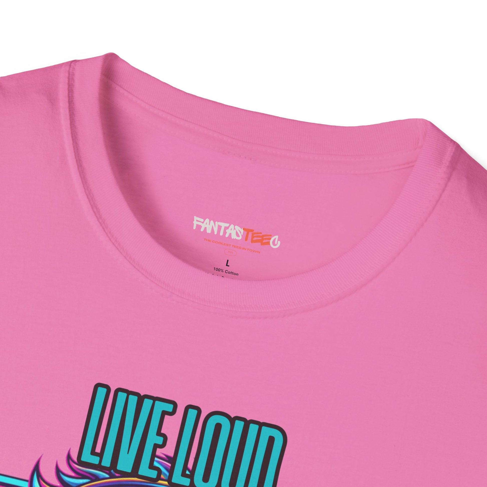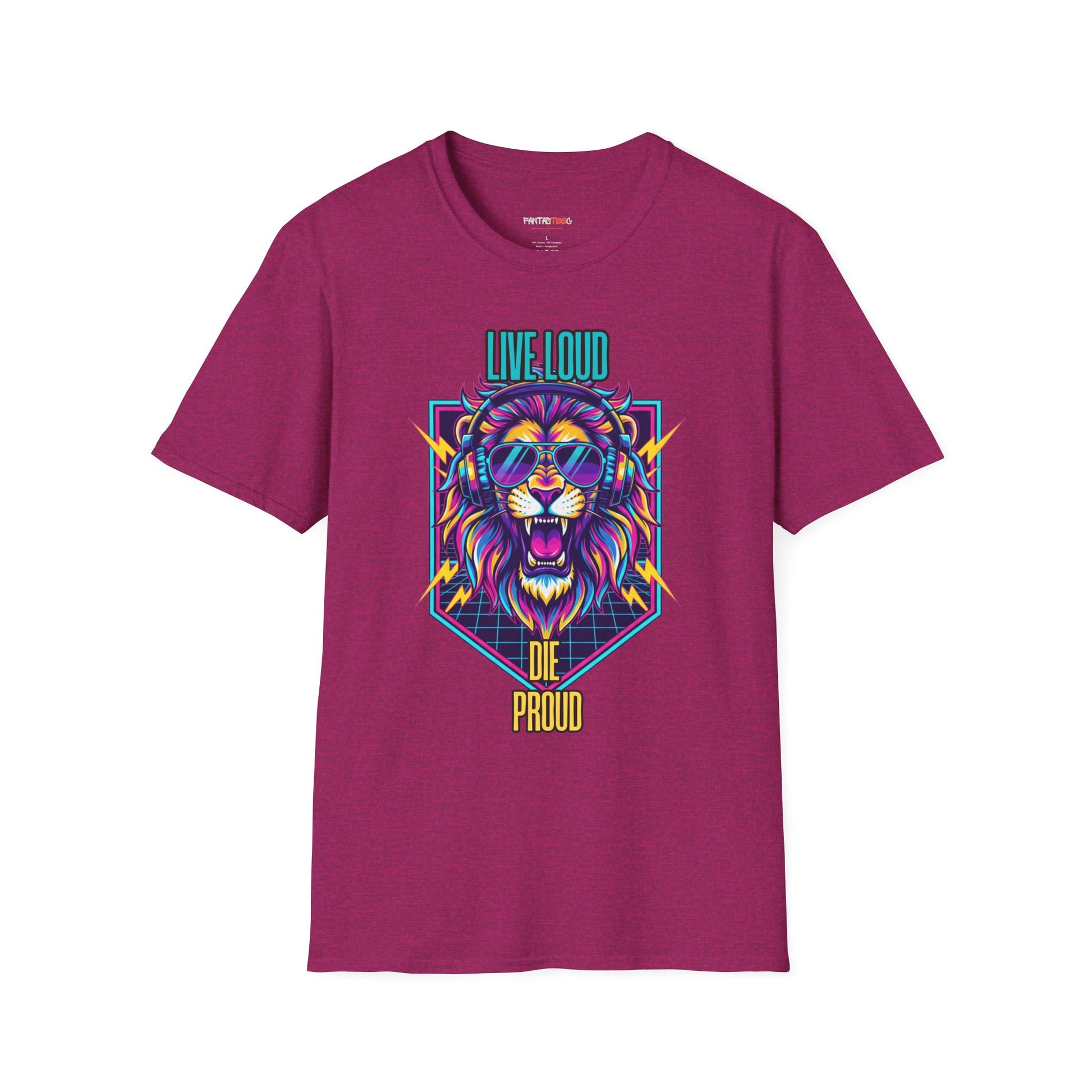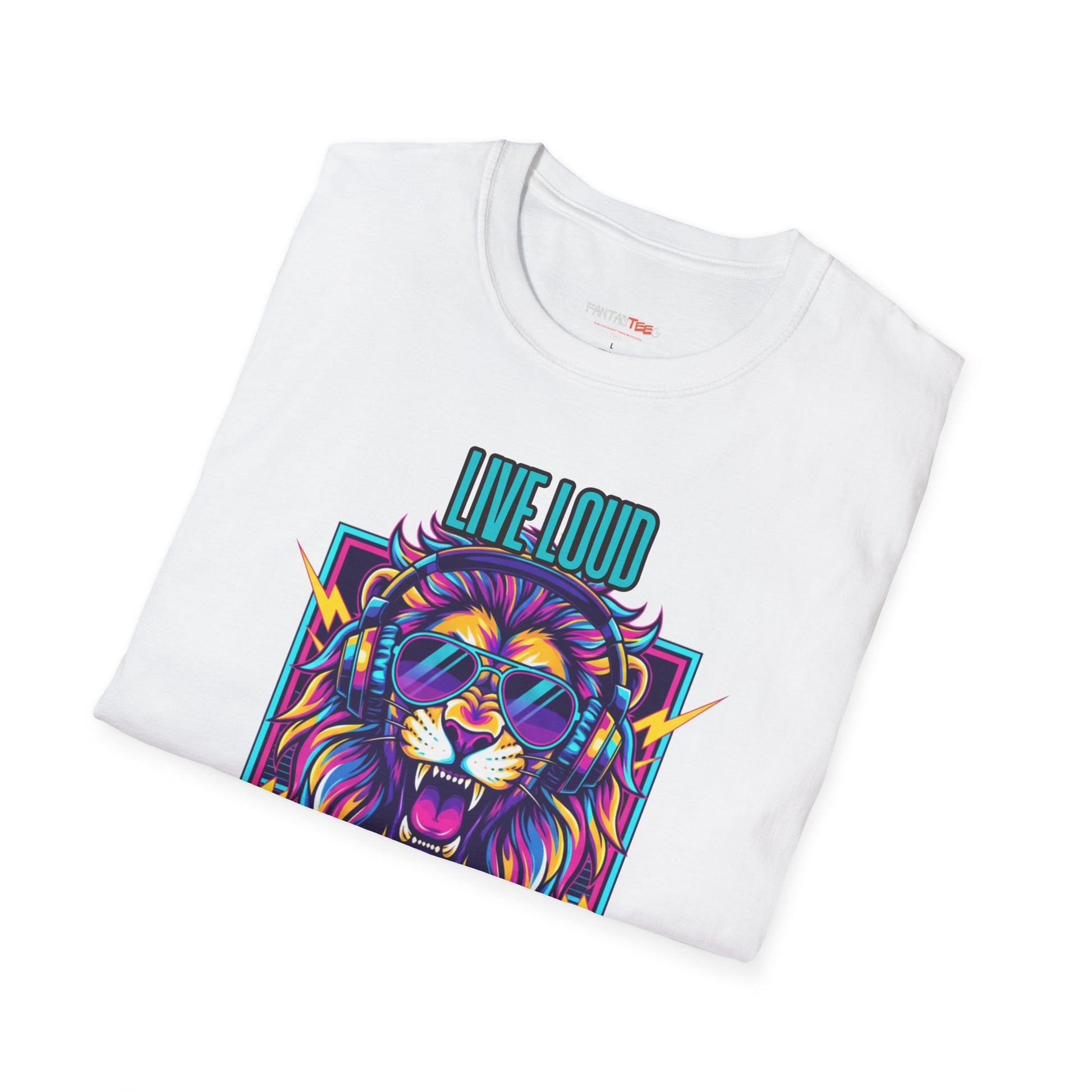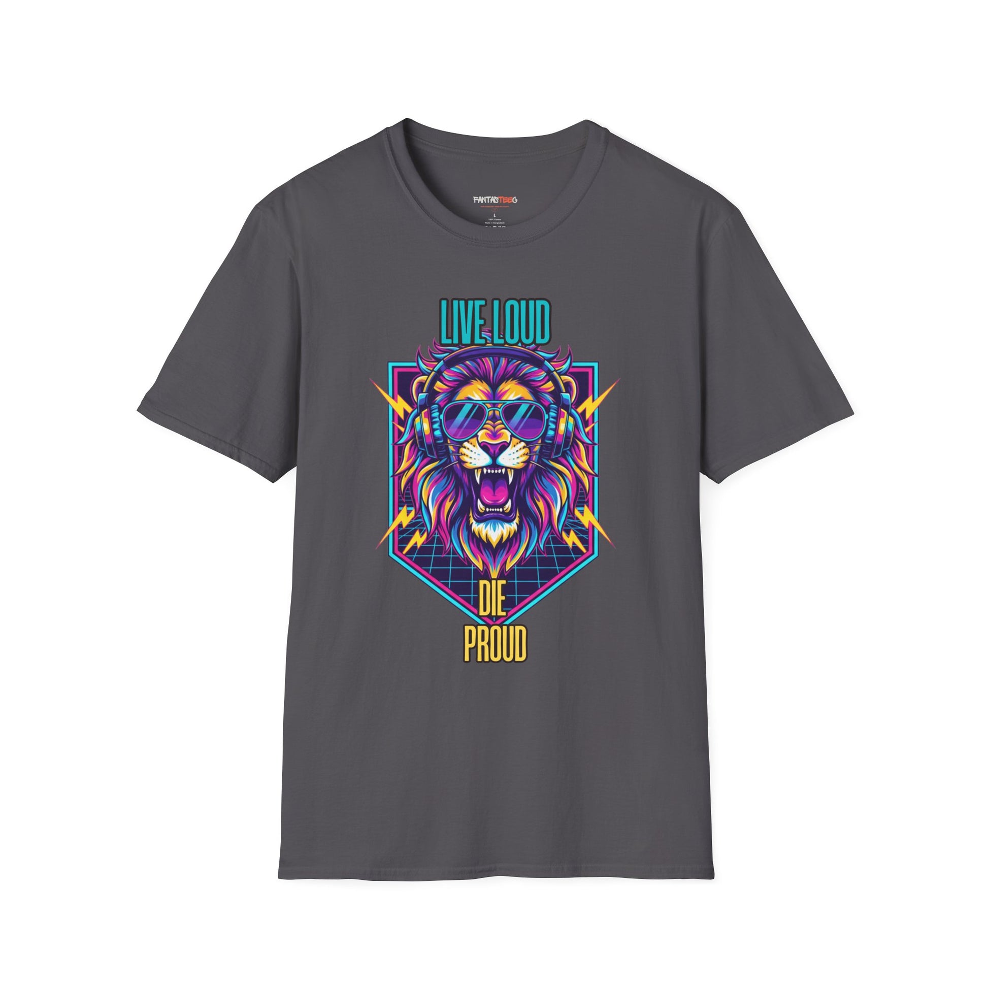 Vibrant Lion Graphic Tee | Unisex Softstyle T-Shirt with 'Live Loud Die Proud' Design, Casual Wear, Gift for Music Lovers.